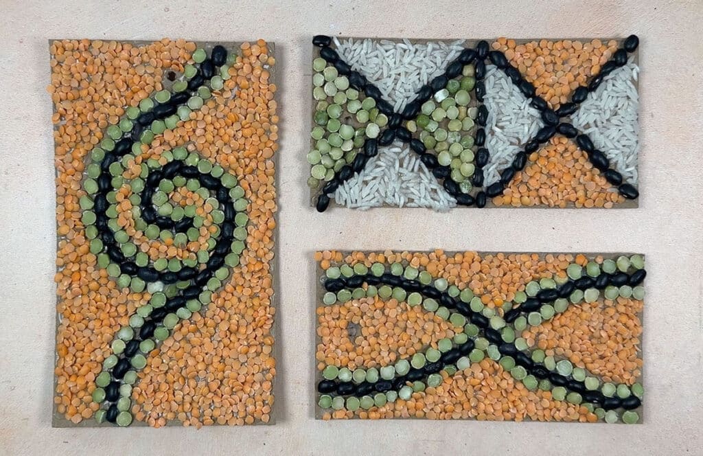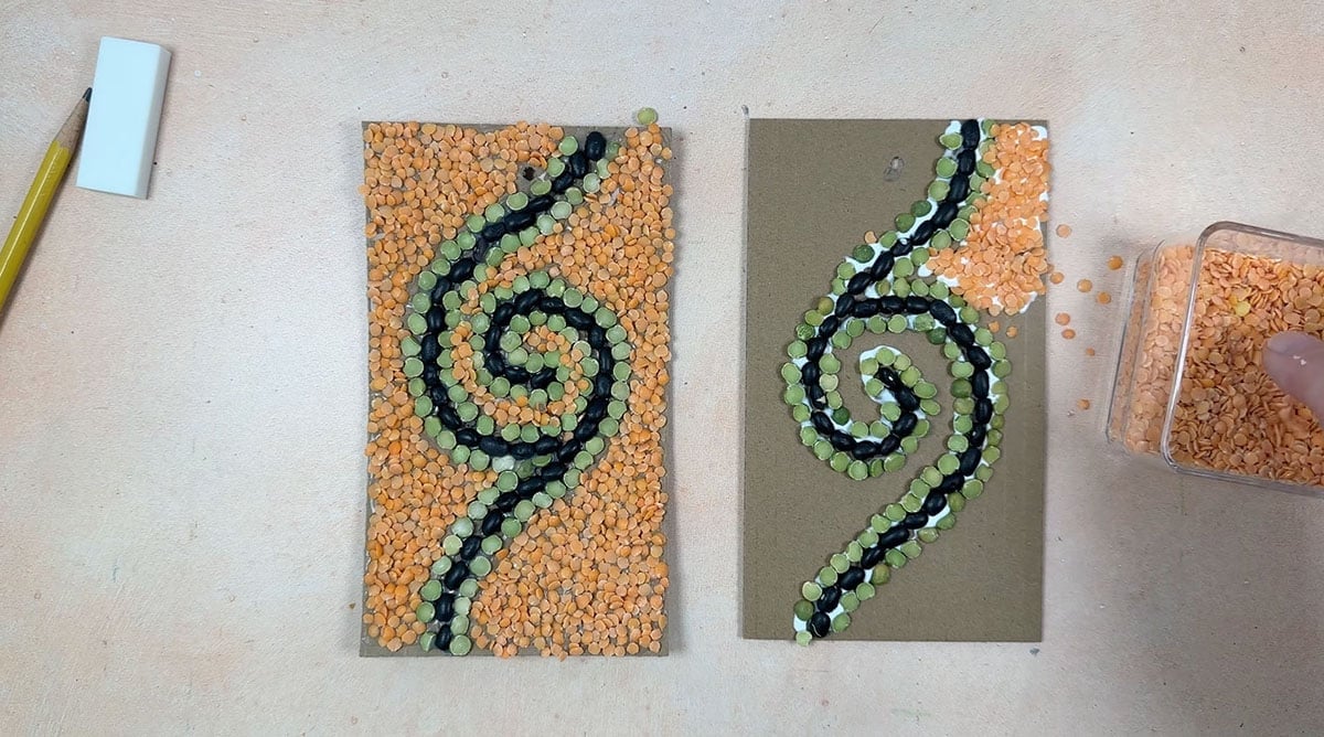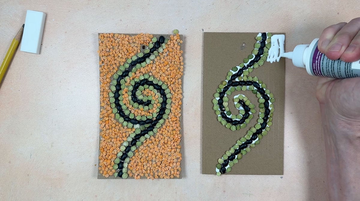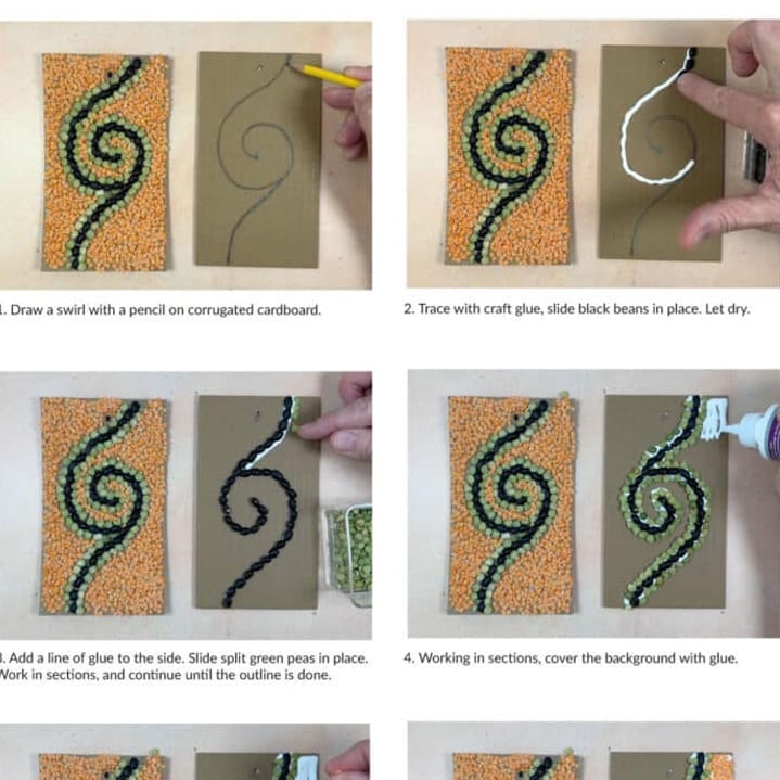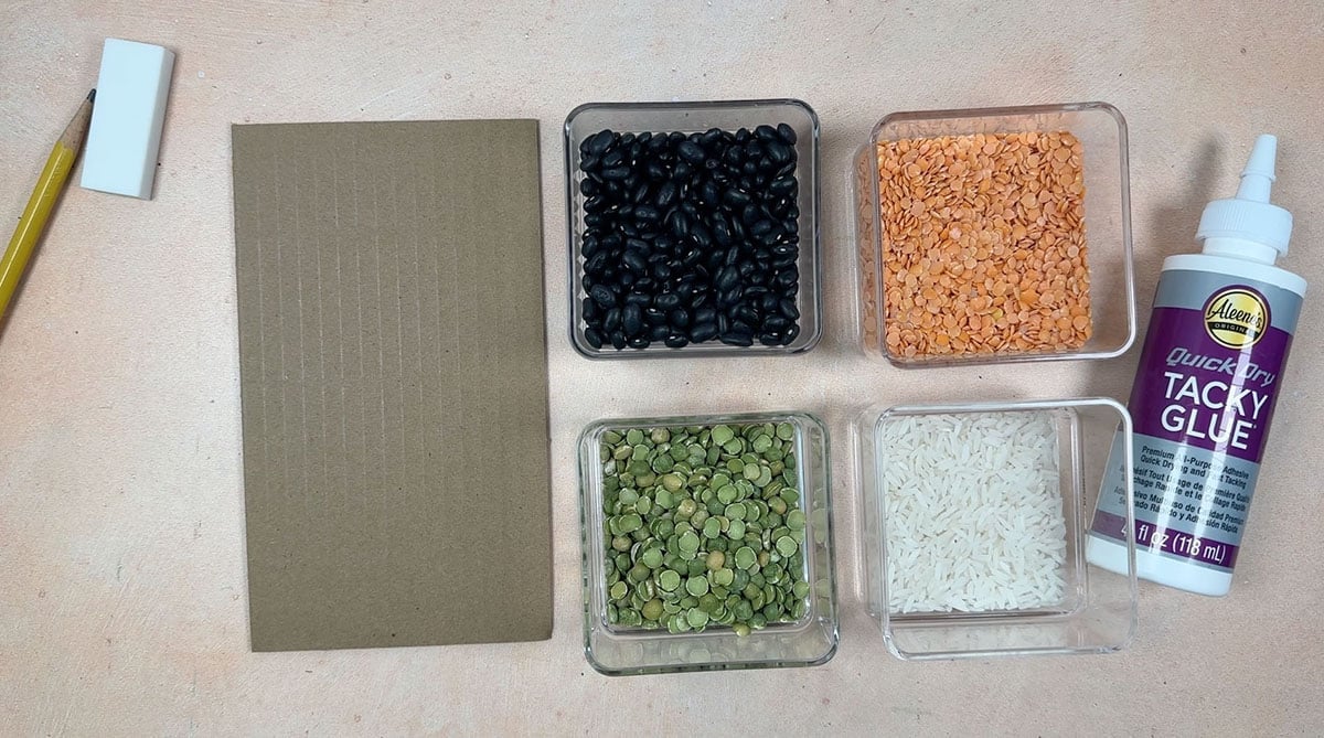 - SUPPLIES: Corrugated cardboard, dried black beans, red lentils, split green peas, white rice, craft glue.