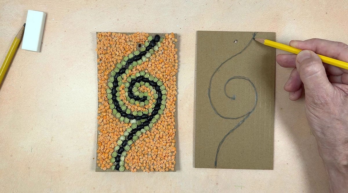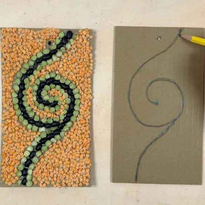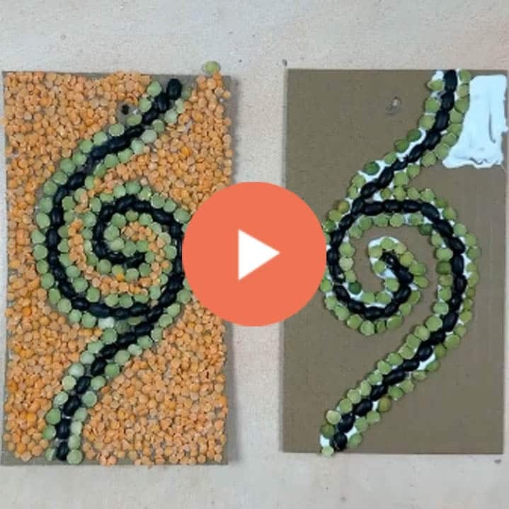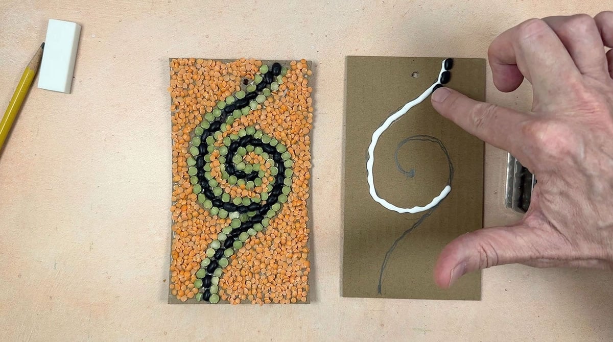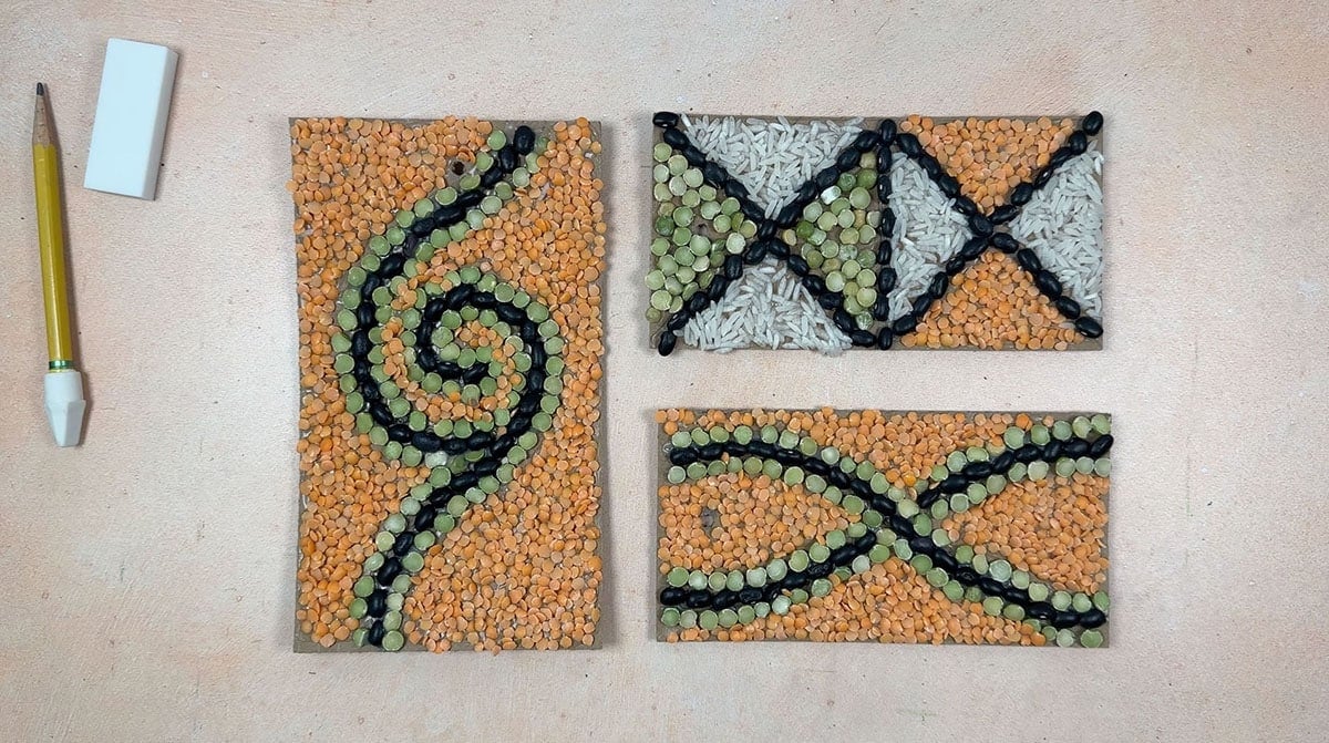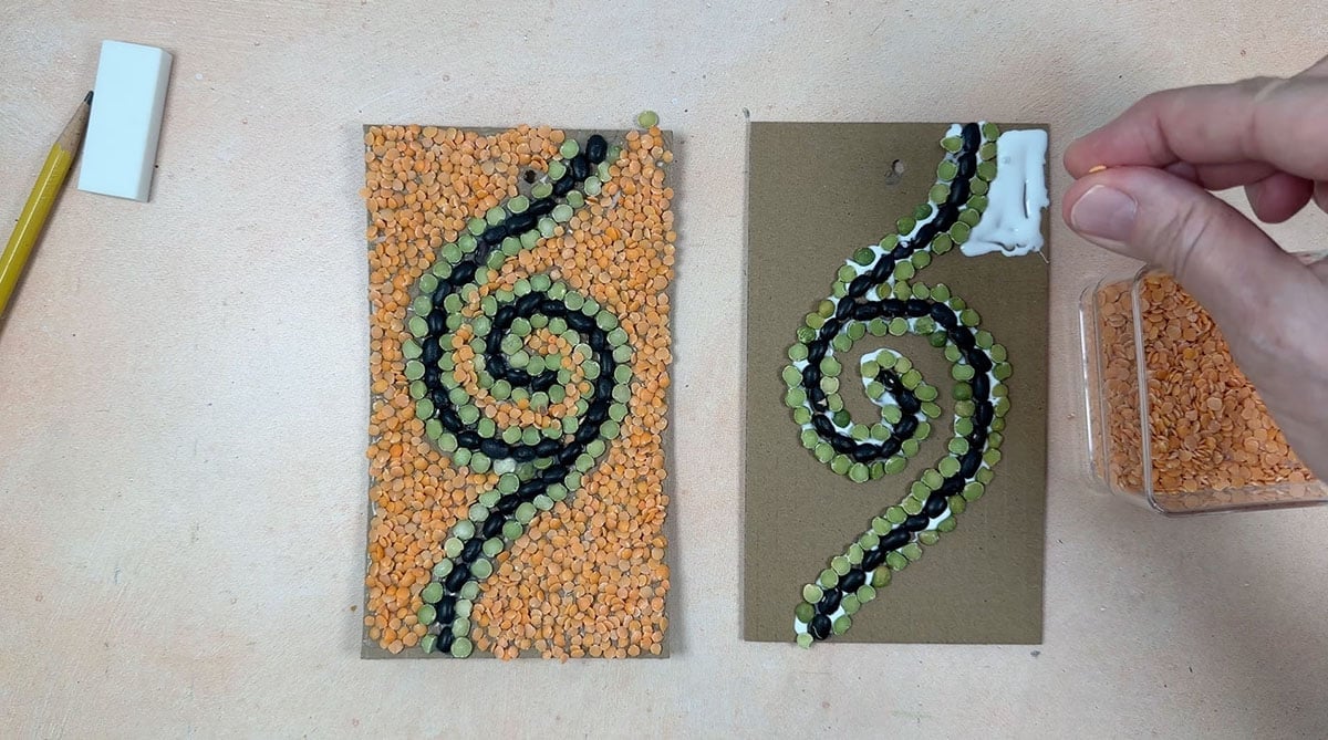 - SUPPLIES: Corrugated cardboard, dried black beans, red lentils, split green peas, white rice, craft glue.