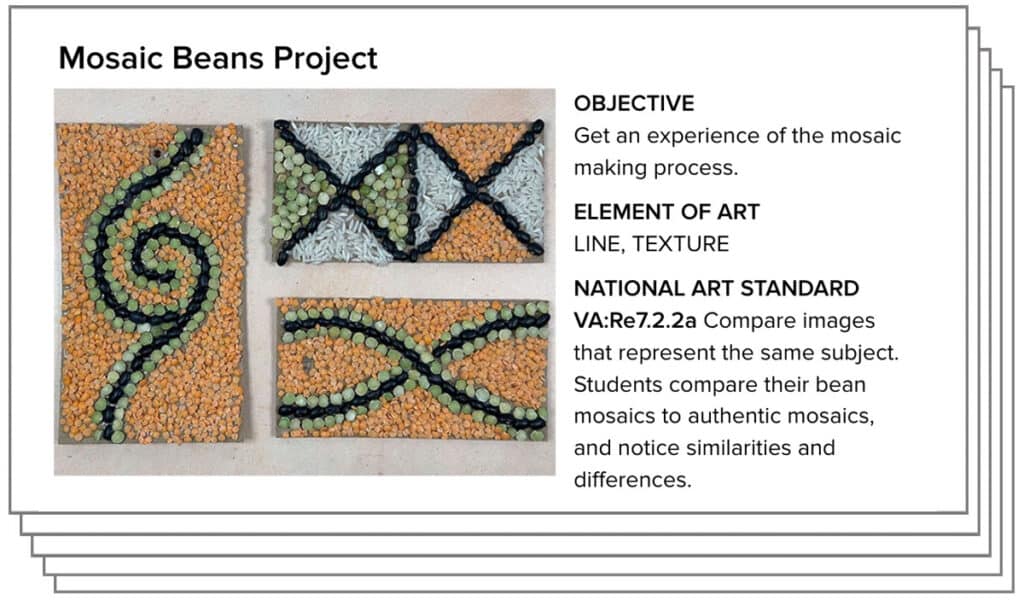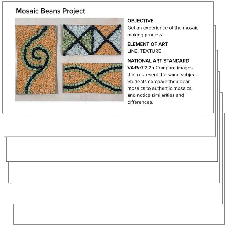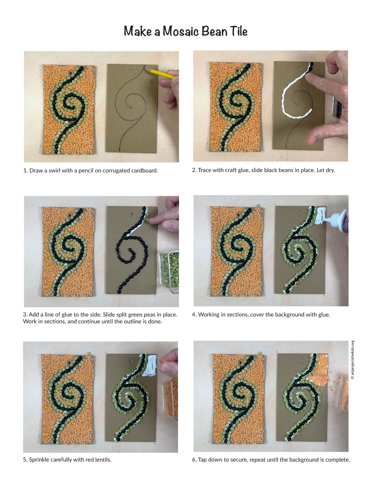 The origin of mosaic art can be traced all the way back to the third millennium BC, and many Greeks and Romans eventually pretty much perfected the technique. Stone, seashells and ivory were often used to make floor mosaics, wall murals and more. The basic process may still be experienced with dried beans for the stones, and craft glue, for the grout. Objective: Learn how to assemble small shapes to make a decorative design.