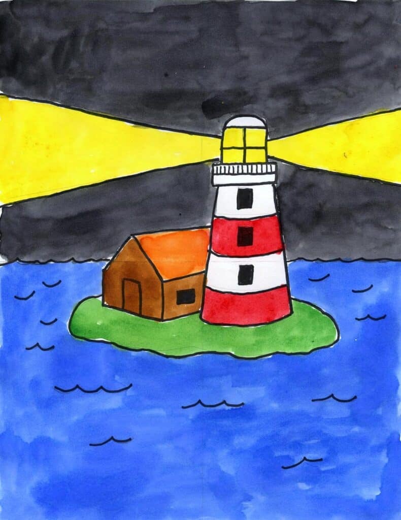 When children learn how to draw a lighthouse, it can be the perfect starting point for imagining life by the sea. This composition includes a cozy little house off to the side, a small island setting, and plenty of open space for students to add their own details—boats in the distance, rolling waves, or even a dramatic stormy sky.