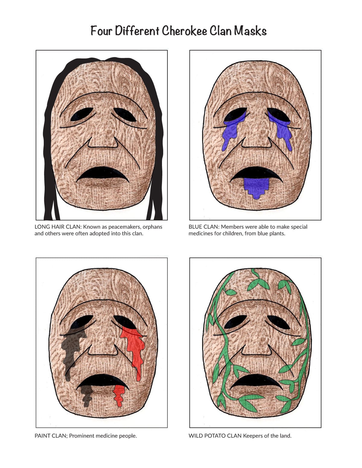 The Cherokee people have a long tradition of using carved masks in storytelling, ceremonies, and to represent different clans — like the Wolf or Deer Clan. These masks often include strong shapes and animal features that carry symbolic meaning.