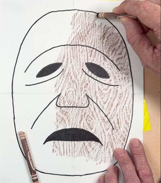 - Trace with a marker, fill in the eyes and mouth. Place a rubbing plate with wood texture underneath the paper and color with brown crayon.