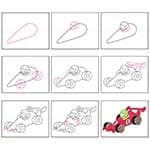 This lesson focuses on key drawing concepts like form, shape, and line, with an emphasis on 3D wheels and the car’s front and rear wings. These details give students a chance to practice shading and perspective in a fun and approachable way.