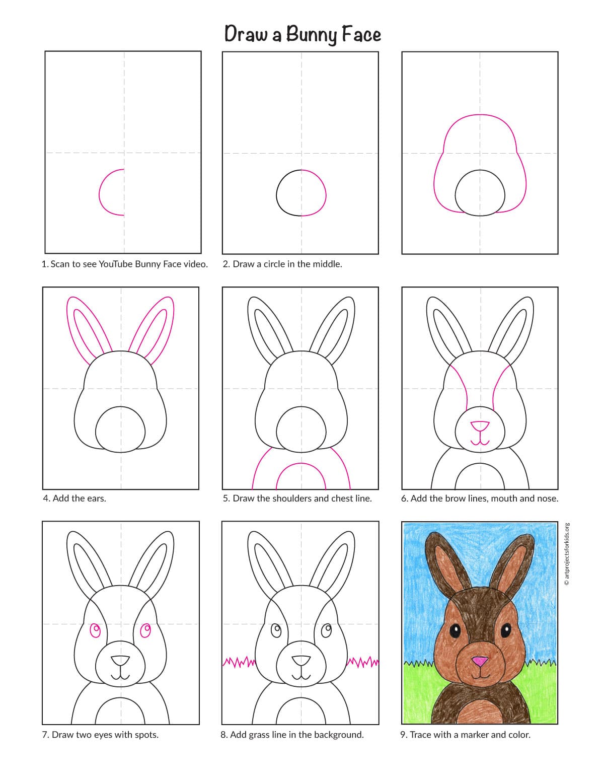 Below you’ll find an easy step-by-step tutorial video for how to draw a Bunny Face. The basic shapes allow for all kinds of coloring variations.