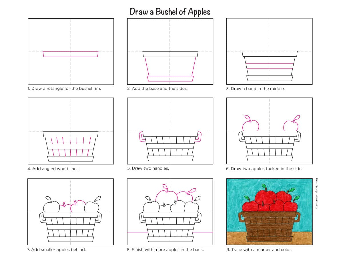 Easy Apple Basket Directed Drawing for Kids: How to Draw a Basket of Apples