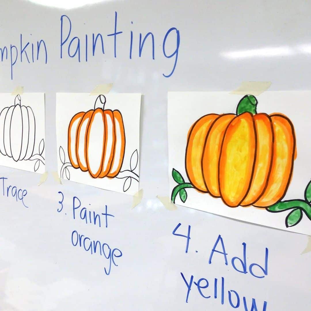 There’s no need to stop with crayons, when it comes to pumpkin drawing projects. The simplicity of their pumpkin shape make them the perfect subject matter for other media too. This pumpkin drawing was turned into a pumpkin painting with just a couple of tempera paint colors. You can see that just the combo of the yellow and orange colors adds so much and makes this pumpkin drawing just jump off the page.
