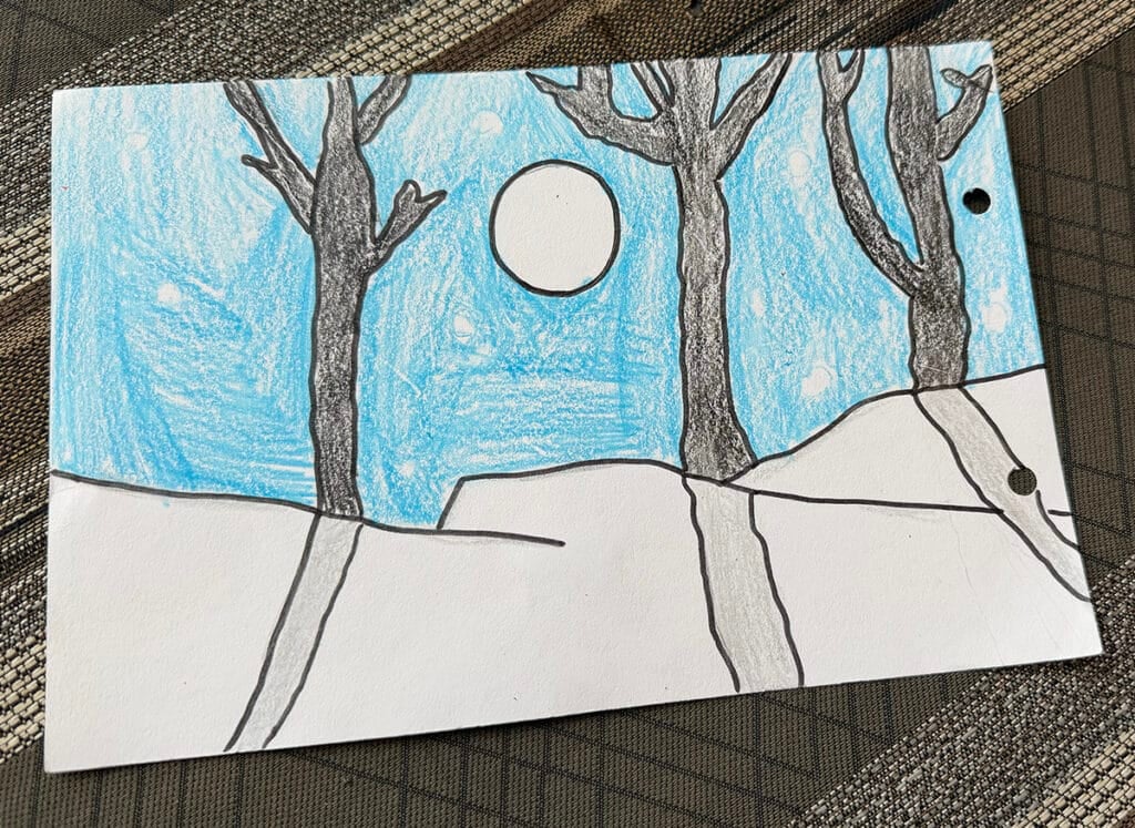 Another benefit of a project like this is that it opens up a chance to talk about color theory, particularly cool colors and how they are used to evoke mood. Winter scenes are a great way to introduce the cool color family — blues, purples — and how they can be layered to create depth and atmosphere.