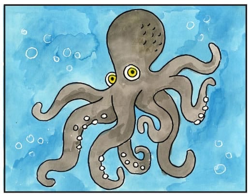 This octopus drawing tutorial was designed to help students draw one with a more active pose than most tutorials do online. By starting with the two outside legs first, then one in the middle, then filling in the rest, students are much more likely to get legs that are all spread out. This is so much closer to what they look like in real life, and not that difficult if you take it one step at a time.
