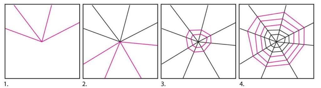 Start with straight lines going to the sides of the square, and add rings that jump from line to line.
