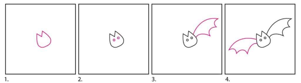 The bat has an angled and pointy head, and wings with scallopled lines on the bottom.