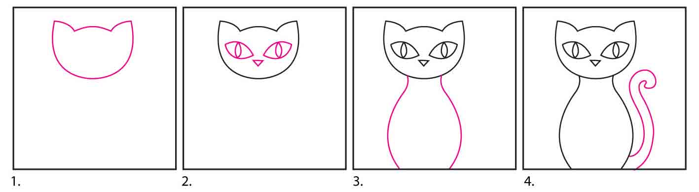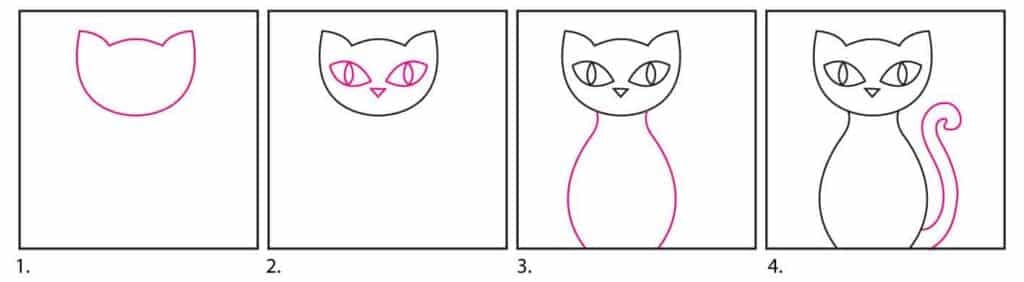 Start the cat with a head, add the two large eyes and nose. Draw the sides underneath, and a tail on the side.