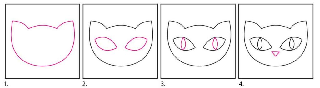 Start the cat face with the outer shape, add two angled eyes, and a triangle nose.