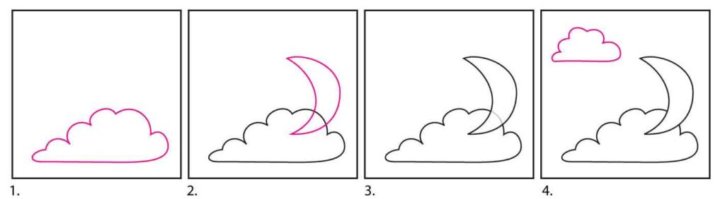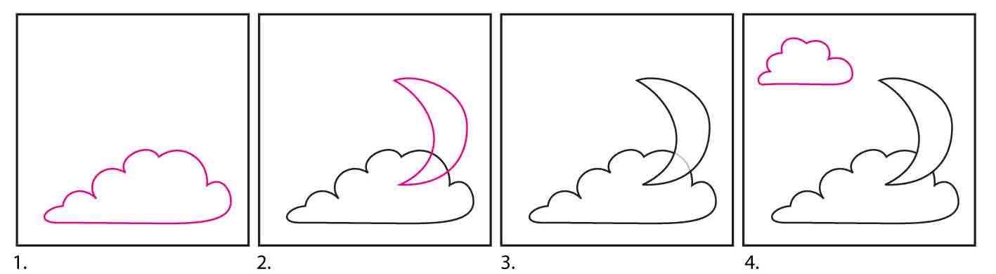 Draw a large cloud with a flat bottom, add the moon, erase the line inside, and finish with a smaller cloud in the corner.