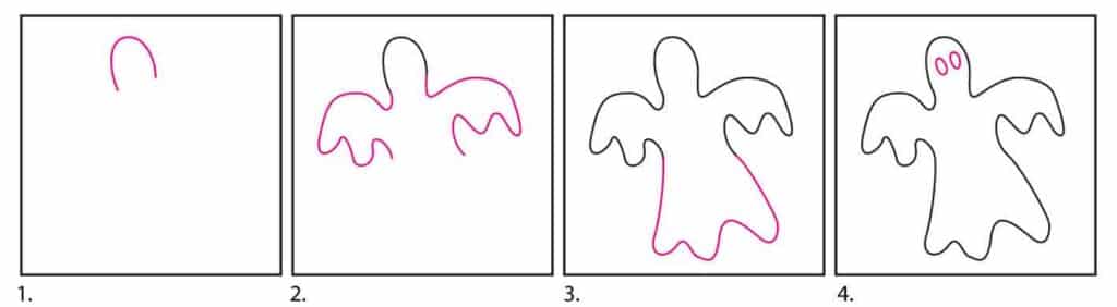This easy ghost is drawn by starting with the head, adding the arms, the flowing shapes underneath, and two oval eyes.