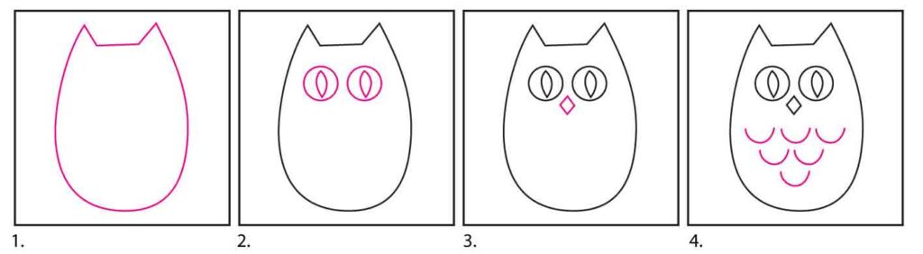 Draw the outside owl shape, two big round eyes, a diamond nose, and simple feathers on the body.