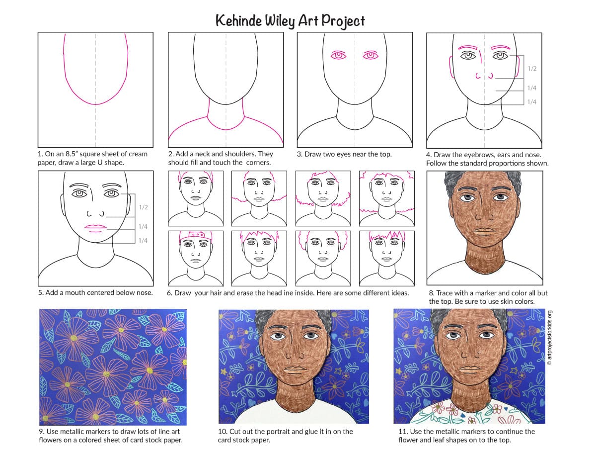 Below you’ll find an easy step-by-step tutorial for a Kehinde Wiley art project. He is known for his naturalistic paintings of black people.