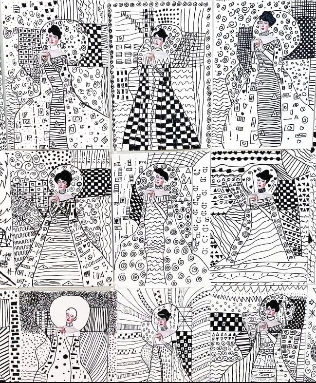 This project is all about contrast and detail. Using only black marker keeps things simple and gives students time to focus on their patterns instead of spending the whole class period coloring. The result is a bold, graphic artwork that feels “Klimt-inspired” while still being completely their own.