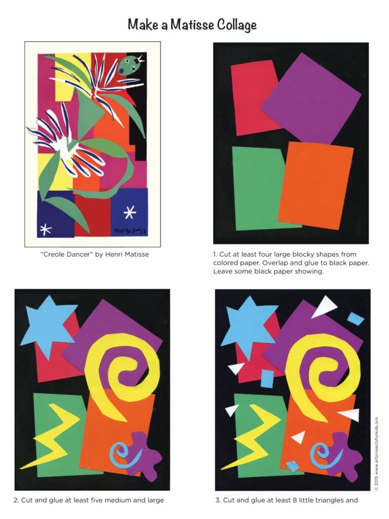 Create a vibrant Matisse-inspired collage with layered cut paper shapes. This easy Matisse art project includes video, steps, and a free printable.