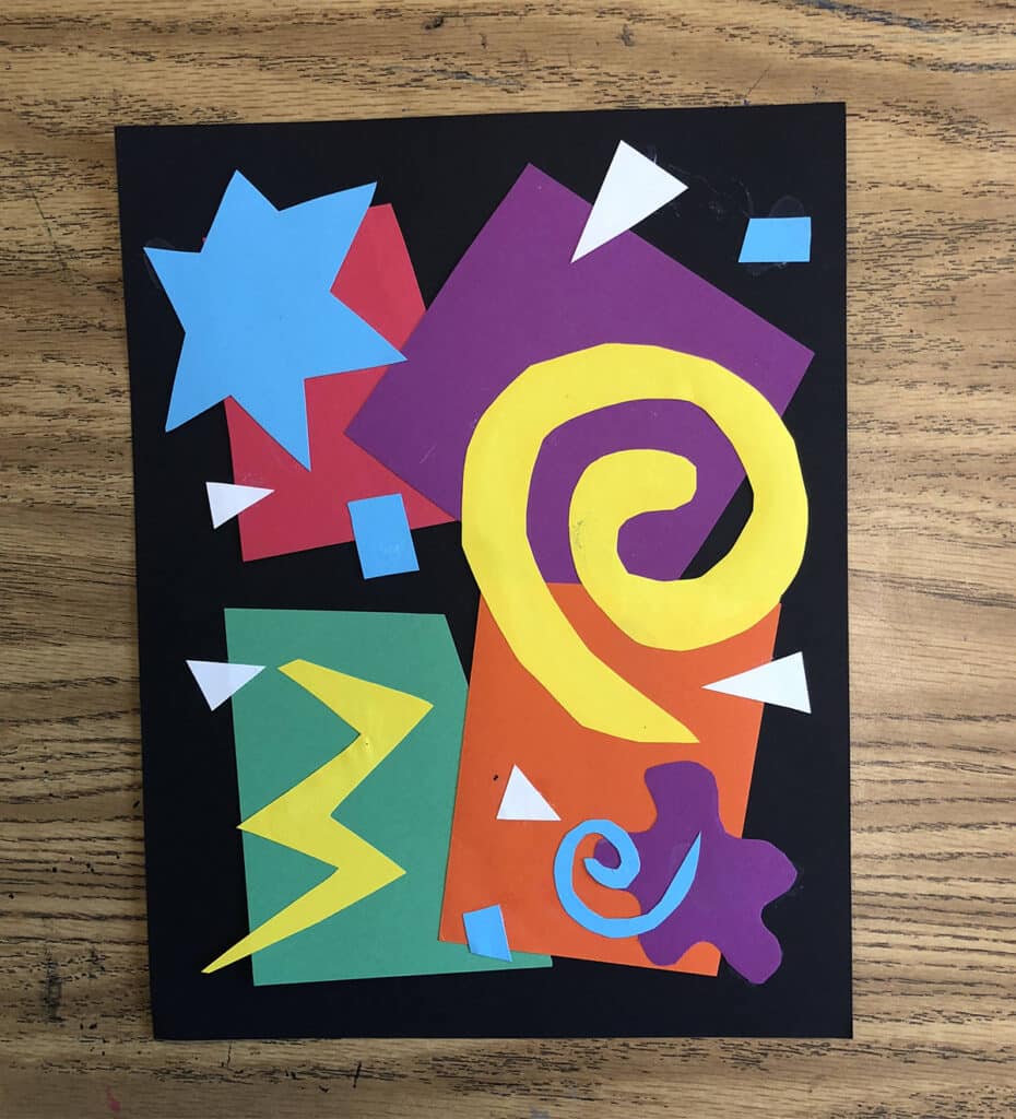 This Matisse collage art project is a fantastic way to introduce your students to the elements of shape, color, and composition without requiring any drawing skills. That makes it especially accessible for younger students or those who may lack artistic confidence.
