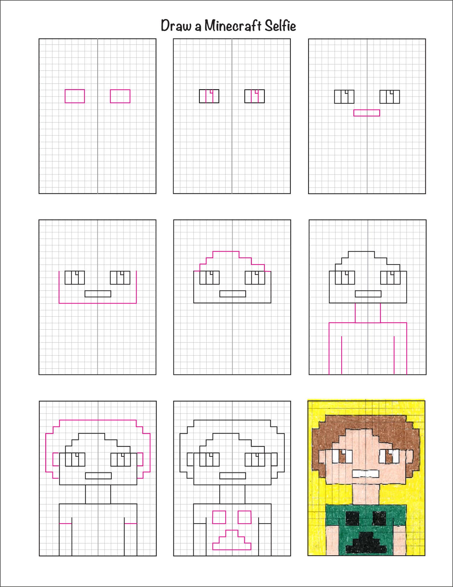 Here’s an easy step-by-step how to draw a Minecraft Self Portrait tutorial and Minecraft coloring page. A grid template page is included.