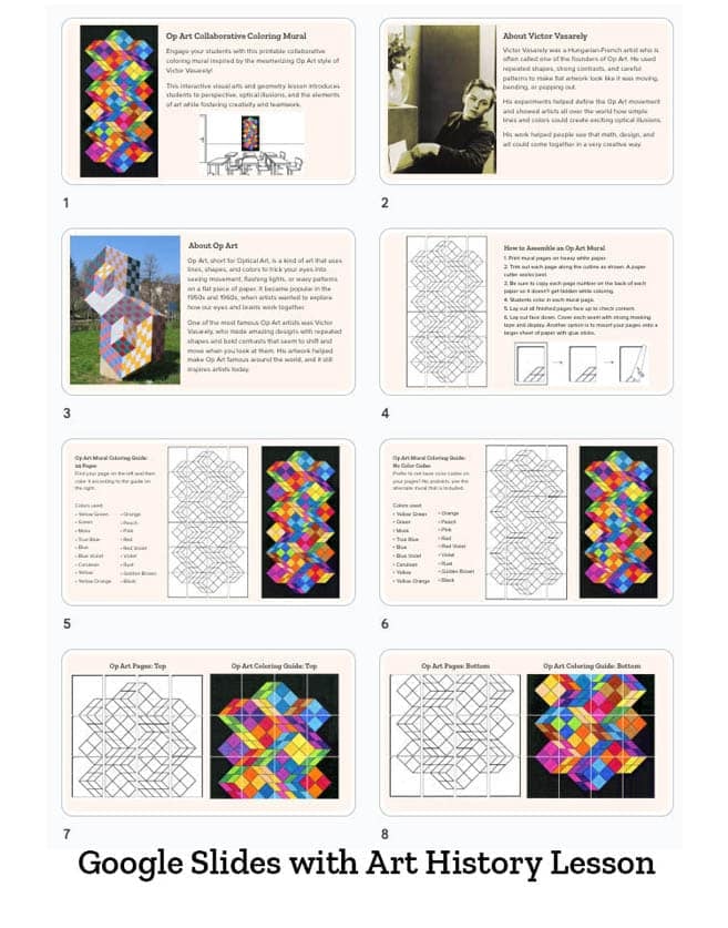 Bring bold op art color to life — without extra prep. This Vasarely-inspired collaborative mural includes printable PDFs + Google Slides, plus both color-coded and free-form templates. Your students stay engaged, your room looks amazing, and you feel calm, confident, and totally prepared.